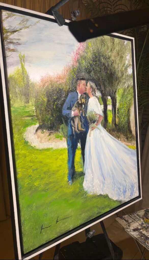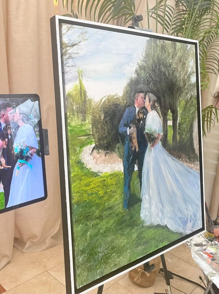 Regalar un cuadro pintado en vivo durante una boda es ofrecer algo irrepetible: una pieza de arte que no solo decora, sino que también cuenta una historia, evoca sentimientos y se convierte en un legado para generaciones futuras. Es el regalo perfecto para recordar que el amor, como el arte, es eterno.